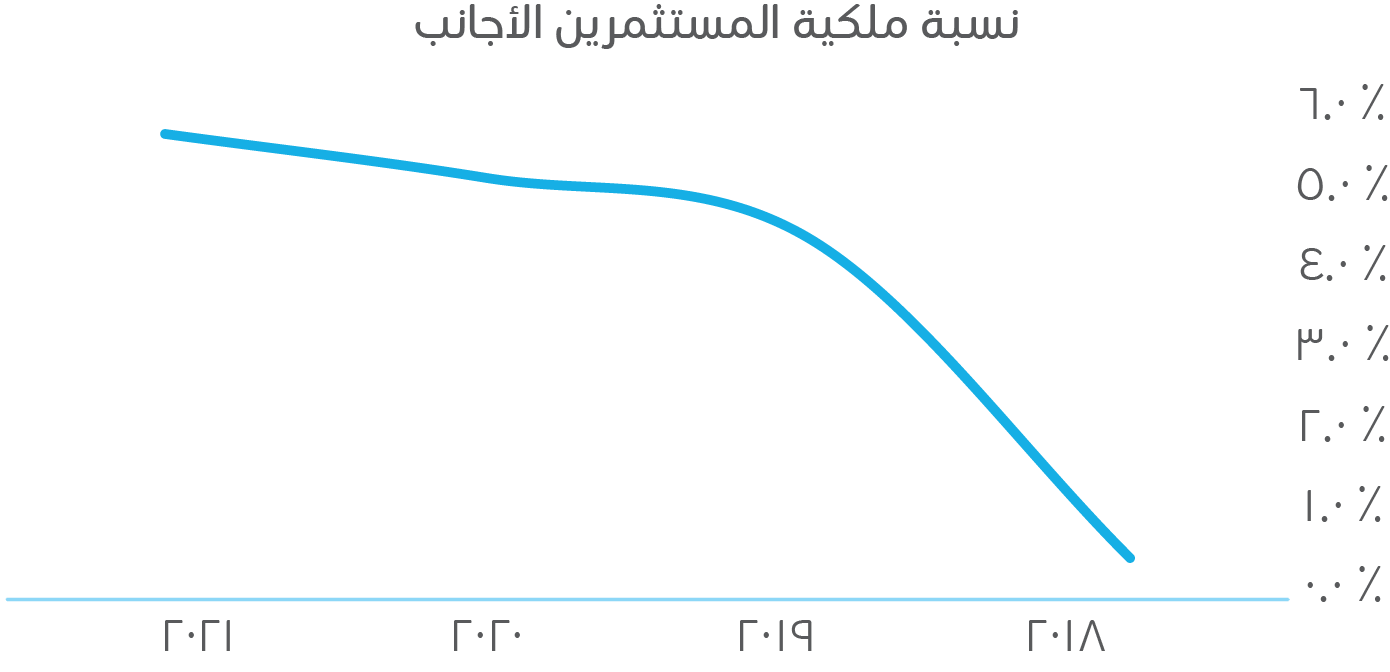 وبعد أن كانت قاعدة المستثمرين الأجانب أقل بكثير من 1٪ في 2018م، بلغت الملكية الأجنبية في نهاية عام 2021م ما يقرب من %5,8 ، تتضمن مزيجًا من الصناديق النشطة وغير النشطة.