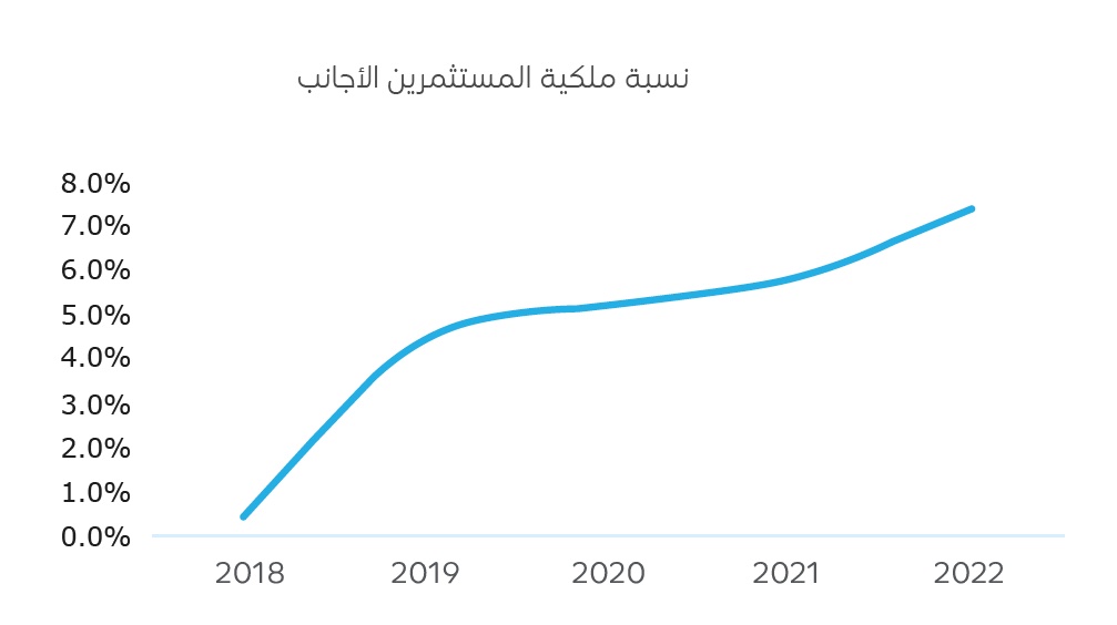 وبعد أن كانت قاعدة المستثمرين الأجانب أقل بكثير من 1% في عام 2018 م، بلغت الملكية الأجنبية ما يقرب من 7.4 %، متضمنةً مزيجًا من الصناديق النشطة وغير النشطة.