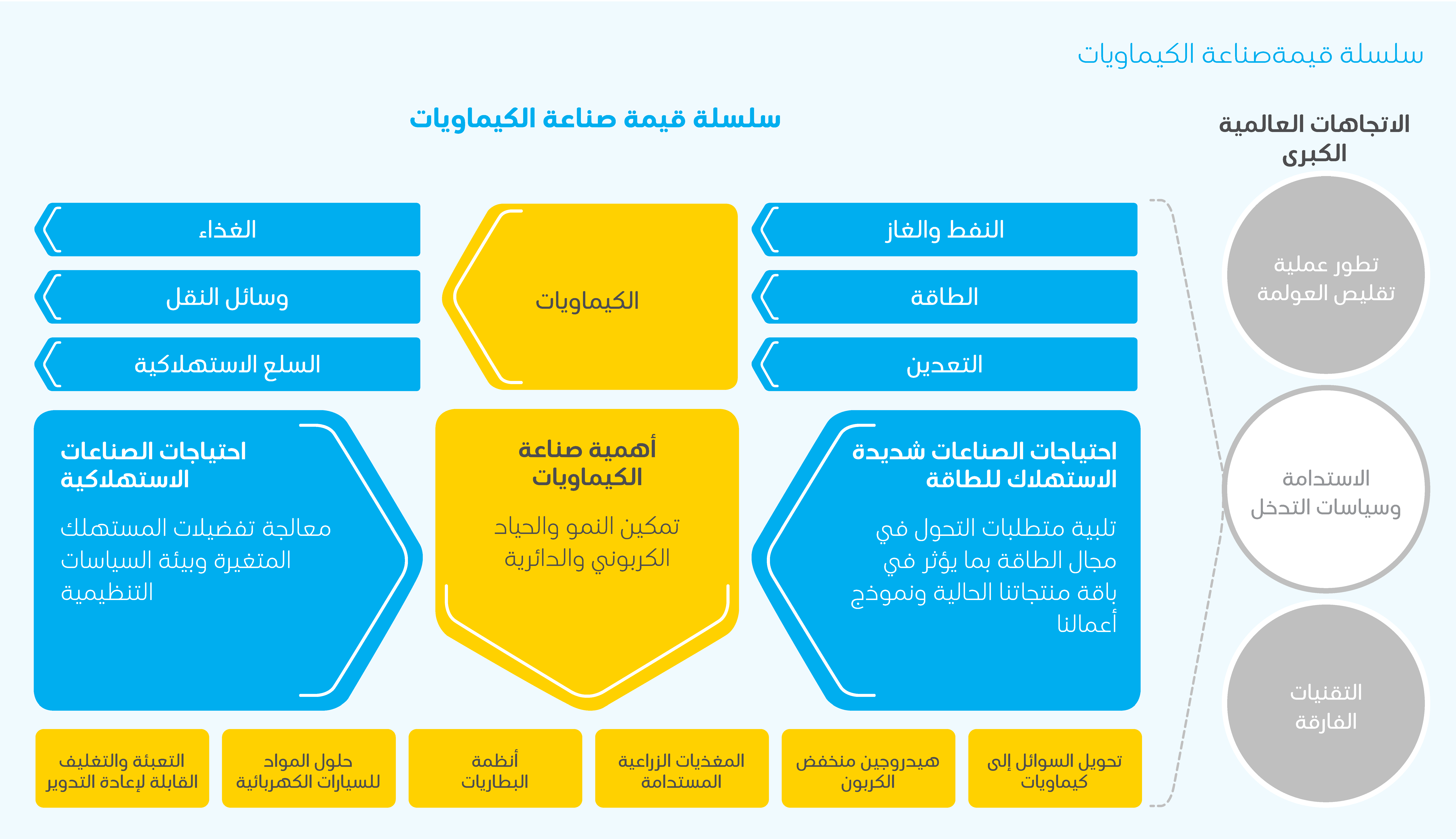 تخوض صناعة الكيماويات العالمية غمار فترة تحول تاريخية، مدفوعة بالتسارع في الاتجاهات الكبرى مثل العولمة الآخذة بالتطور، وزيادة التركيز على الاستدامة، والتحول في مجال الطاقة، وتقدم التقنيات الرقمية، والتغييرات التي تطرأ على التركيبة السكانية. وتشهد المملكة مرحلة تحولية من خلال جهودها الرائدة في إطار (رؤية السعودية 2030)؛ حيث تؤدي صناعة الكيماويات دوراً بالغ الأهمية في تحقيق مستهدفات الرؤية عبر جميع ركائزها، بما في ذلك دعم النمو الاقتصادي وتنويع الأنشطة الاقتصادية. ويؤدي هذا إلى إعلاء شأن صناعة الكيماويات عبر سلسلة القيمة.
