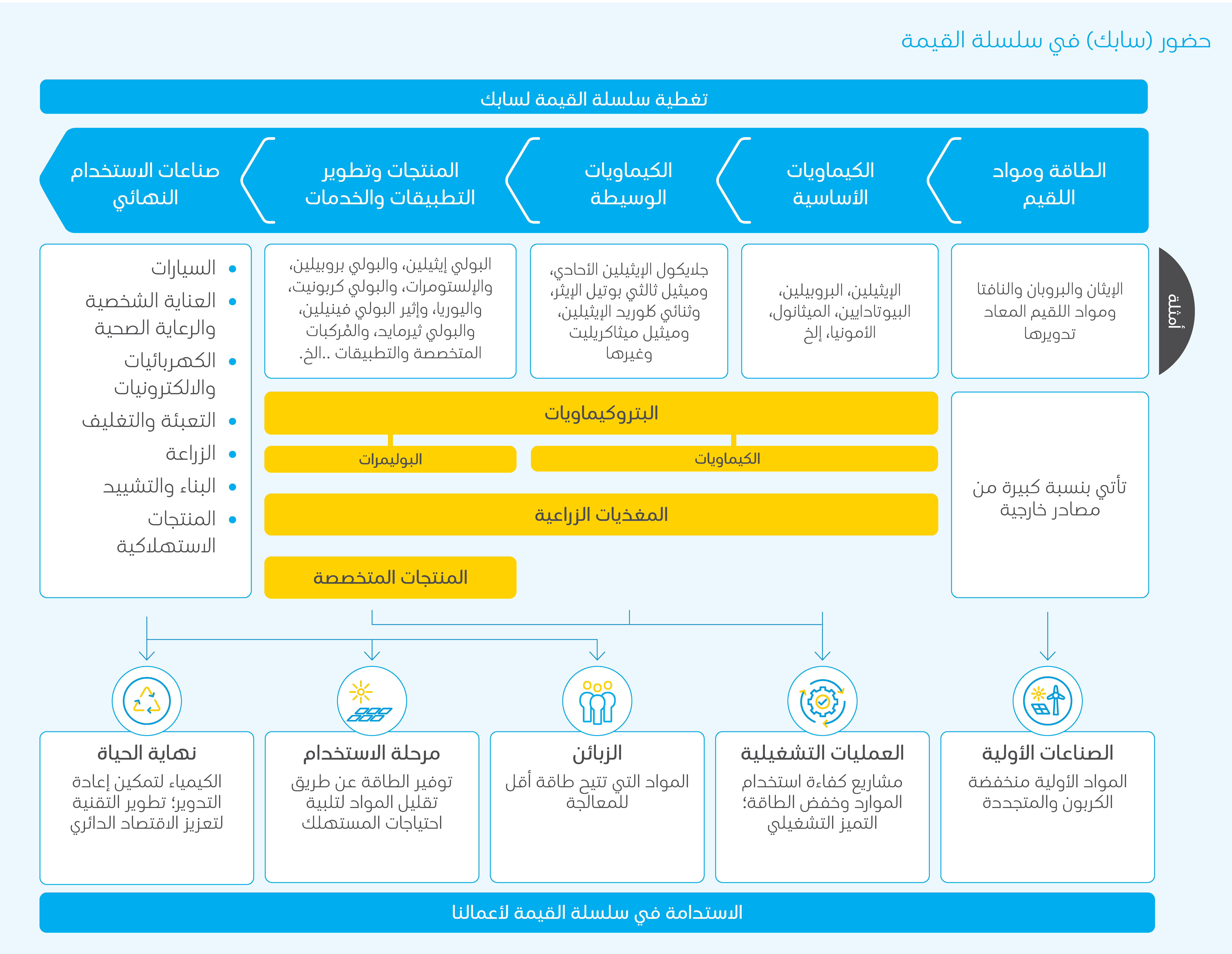 تأتي (سابك) ضمن الشركات الرائدة عالمياً في إنتاج الأوليفينات والجلايكول والأوكسجينات، ويرجع هذا النجاح إلى النمو المستمر والنجاحات الاستراتيجية التي حققتها على مدى السنوات الماضية. وتحرص (سابك) على مضاعفة القيمة وتوسيع باقة منتجاتها الكيماوية من خلال: