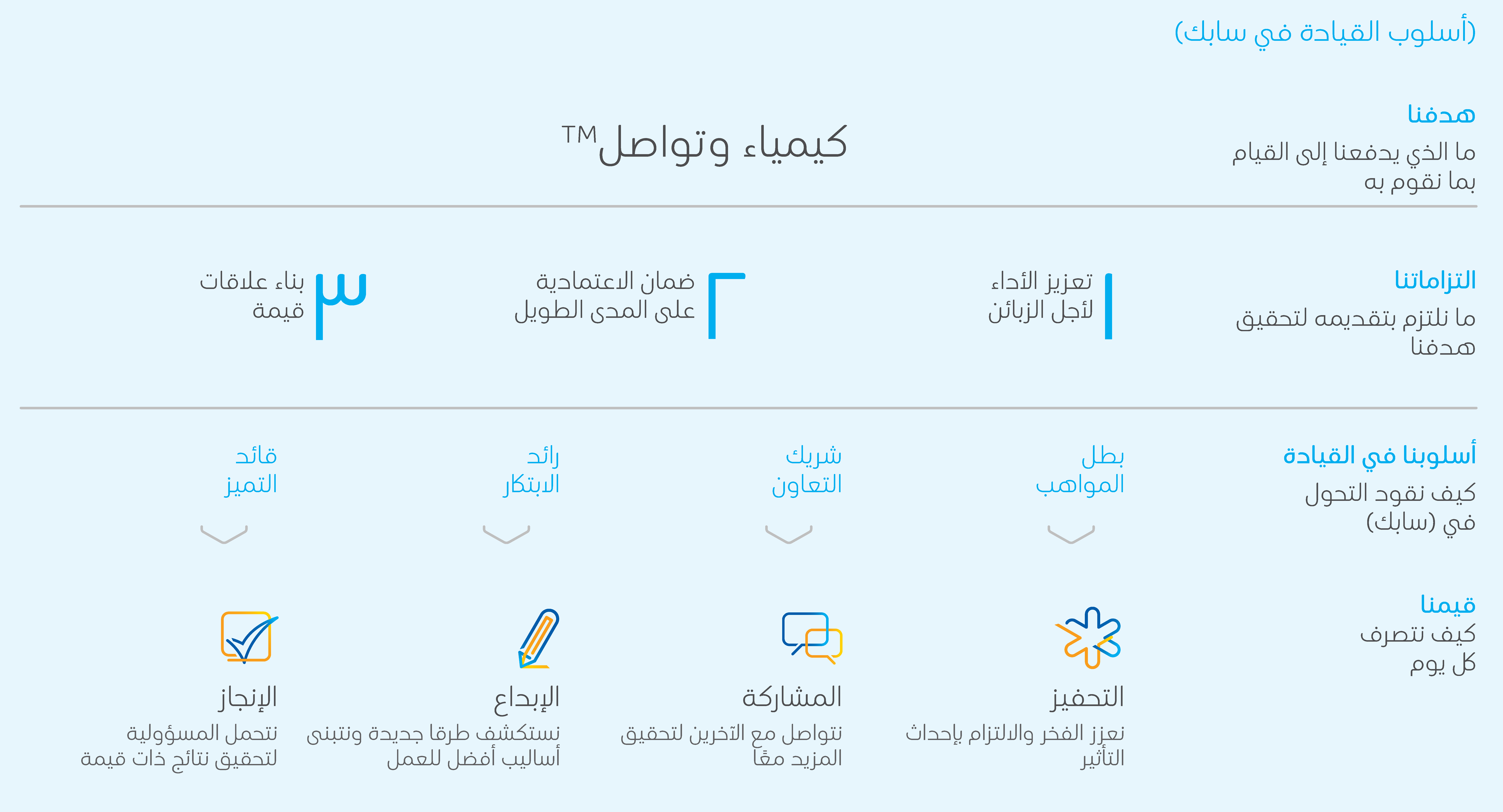 يضع إطار قيادتنا، أو ما يُعرف بأسلوب القيادة في (سابك)، مجموعة المبادئ التوجيهية التي تجمع الخصائص الفريدة لقيادة عالمية المستوى في (سابك). والقائد في (سابك) هو كل شخص يعمل بها؛ بدءاً بالمشغلين في ساحات المصانع ووصولاً إلى الرئيس التنفيذي. وهناك أولويات أربع لأسلوب القيادة في (سابك) تسير جنباً إلى جنب مع قيم الشركة وتوضح الطريقة التي تقود بها أعمالها اليومية وتغرس لديها قيم النزاهة والمسؤولية والمساءلة وتحفّزها على دعم تنمية مهارات القيادة لدى الآخرين.