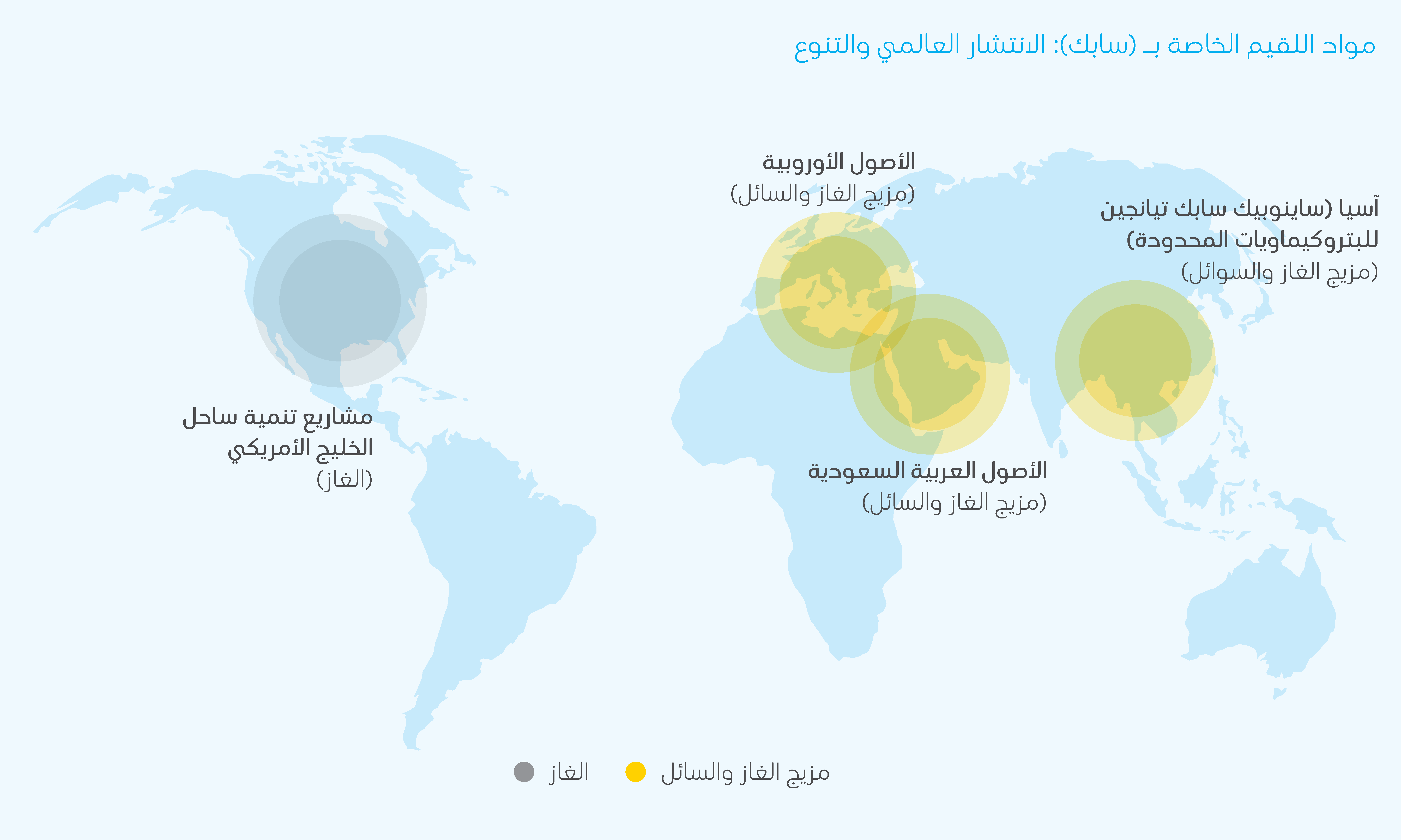 بالنسبة لأصولنا في المملكة العربية السعودية، لدينا وصول إلى المواد الخام التي يتم توفيرها بموجب عقود طويلة الأجل مع (أرامكو السعودية) كمورد رئيس، والتي تمثل 76% من إجمالي الإمداد المحلي. وتُعد (أرامكو السعودية) من الشركات الرائدة عالمياً في خفض انبعاثات غازات الاحتباس الحراري، بما في ذلك ثاني أكسيد الكربون والميثان وحرق الغازات، من خلال نظامها لإنتاج الهيدروكربونات. وتُنوّع (سابك) مصادر مواد اللقيم الرئيسة لمرافقها خارج المملكة العربية السعودية بالاعتماد على العديد من الموردين، ويستهدف ذلك تقليل مخاطر الإمدادات وضمان استمرارية العمليات. وتعتمد وحدات تكسير السوائل التابعة لشركة (سابك) في أوروبا على مصادر خارجية لتوفير المواد الخام. بينما بدأت سابك في العام 2022م تشغيل وحدتها الخاصة بتكسير الإيثان في المنشأة التابعة لمشروع تنمية ساحل الخليج المشترك مع إكسون موبيل في الولايات المتحدة الأمريكية. ويستخدم مشروع التكسير المشترك في الصين (سابك ساينوبك) مزيجاً من مواد اللقيم السائلة والغازية.
