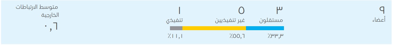 | 9 أعضاء | 3 مستقلون (33.3%) 5 غير تنفيذيين (55.6%) 1 تنفيذي (11.1%) | متوسط الارتباطات الخارجية 0.6 |