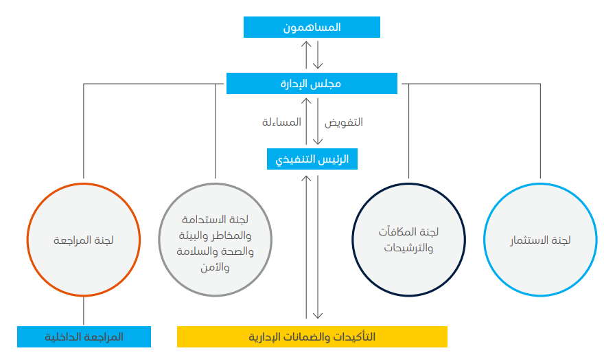 تقع على عاتق مجلس إدارة (سابك) المسؤولية الكاملة عن تعزيز النجاح المستدام للشركة على المدى الطويل. تساند "لجنة الاستدامة والمخاطر والبيئة والصحة والسلامة والأمن" مجلس الإدارة في مراقبة أداء الشركة فيما يتعلق بمجالات الصحة والسلامة وسلامة إجراءات العمل والأمن والبيئة وحقوق الإنسان والمسؤولية الاجتماعية، كما تتولى اللجنة مراقبة جميع المخاطر الاقتصادية والبيئية والاجتماعية الجوهرية ورصدها، وتقديم التوصيات اللازمة بشأنها إلى مجلس الإدارة وفق الحاجة. يرأس اللجنة التنفيذية في (سابك) الرئيس التنفيذي، وتضم اللجنة نواب الرئيس التنفيذي لوحدات العمل الاستراتيجية والإدارات المركزية، بمن في ذلك كبير مسؤولي الاستدامة. وتتولى اللجنة التنفيذية مسؤولية وضع رؤية الاستدامة وأولوياتها وأهدافها، كما تتحمل المسؤولية الكاملة عن أداء الشركة وفقاً لأهداف الاستدامة.