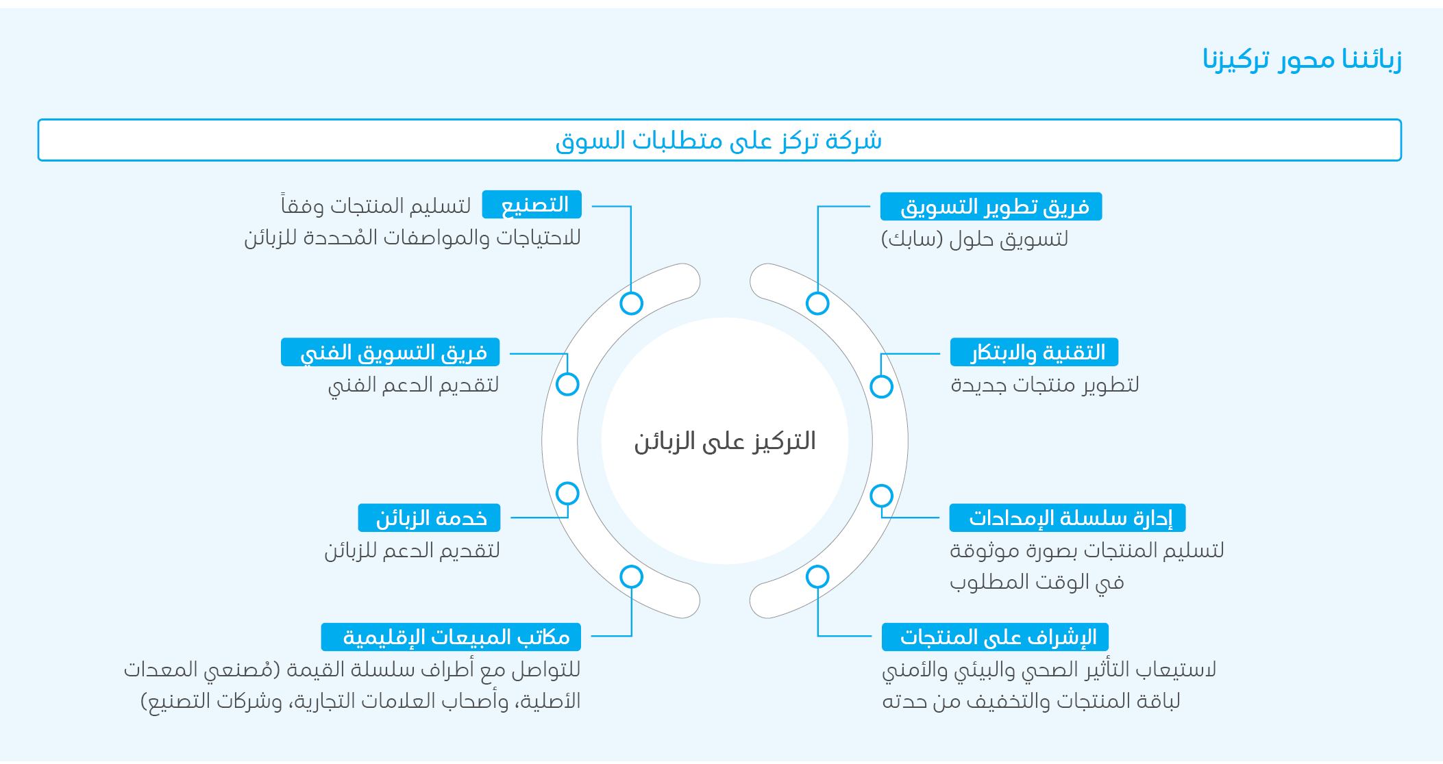 وفي إطار جهودنا على مدى العام 2024م، عززنا تركيزنا على مستوى "تطوير أعمال الزبائن" من خلال الاستفادة من خبرتنا المباشرة في التعامل مع السوق، ودمج خبرات الصناعة التي اكتسبناها عبر فرق المبيعات والفرق الفنية الخاصة بنا، إلى جانب تعزيز ميزتنا في أن نكون أقرب إلى الزبائن عبر تطوير هياكل مبيعات عالمية موحدة. وتم دعم هذه الخطوة من خلال الشفافية التي خلقها برنامج "إدارة علاقات الزبائن" والالتزام القيادي القوي تجاه الابتكار والتعاون عبر سلسلة القيمة، ما أسفر عن إيجاد العديد من الحلول خلال 2024م