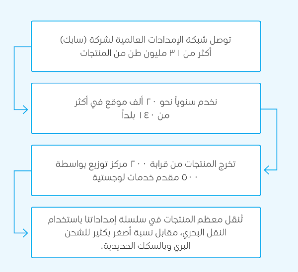 تركز استراتيجية سلسلة إمداداتنا على توفير خدمات توصيل موثوقة للزبائن، مع إعطاء الأولوية للابتكار الرقمي والممارسات المستدامة.