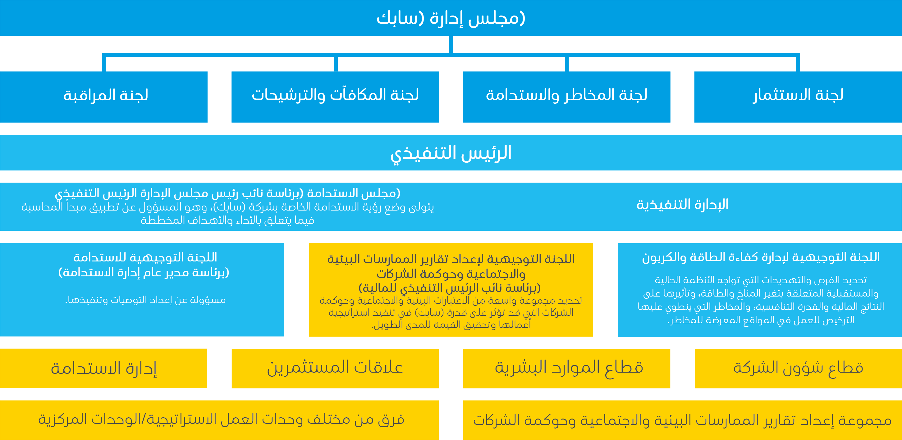 تشكل الاستدامة جزءًا لا يتجزأ من هيكل الحوكمة، بدءًا بمجلس الإدارة وصولً إلى قادة الاستدامة والوحدات الإدارية. ويتم رفع التقارير عن أداء الاستدامة إلى أعلى المستويات في الشركة، بما في ذلك رئيس مجلس الإدارة ونائب رئيس مجلس الإدارة الرئيس التنفيذي وأعضاء المجلس.