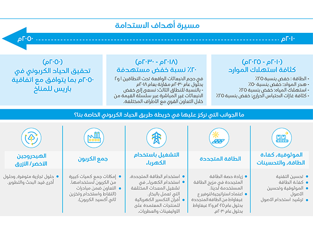 تعهّدنا عام 2021 م بالتزام تحقيق الحياد الكربوني في جميع عملياتنا بحلول عام 2050 م. وتحقيقًا لهذا الهدف وضعت وحدة كفاءة الطاقة وإدارة الكربون - بمشاركة ممثلي جميع وحدات الأعمال الاستراتيجية وإدارة الاستدامة - خريطة طريق الحياد الكربوني الخاصة ب (سابك). وتحدد خريطة الطريق الرؤية الشاملة لتحقيق صافي انبعاثات صفري بحلول عام 2050 م بالإضافة إلى هدف مؤقت يتمثل في تقليل انبعاثات غازات الاحتباس الحراري (انبعاثات النطاقين الأول والثاني) بنسبة 20 ٪ مقارنةً بالنسبة المرجعية لعام 2018 م بحلول 2030 م.