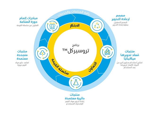 تسهم حلولنا من البوليمرات الدائرية المعتمدة - المستندة إلى نهج توازن الكتلة وفقًا لبرنامج الشهادة الدولية للاستدامة والكربون ISCC - بتهيئة محتوى مواد اللقيم الناجم عن إعادة التدوير الكيميائي المتقدم للنفايات البلاستيكية المختلطة، وتسهم في التخفيف من استنفاد الوقود الأحفوري. وقد نجحت (سابك) عام 2022 م في معالجة 2.6 ألف طن من زيت الانحلال الحراري في وحدات التكسير الخاصة بها بالإضافة إلى عشرة آلاف طن إضافية من مواد اللقيم المتجددة لإنتاج البوليمرات صديقة البيئة، وسيتم تشغيل أول وحدة تجريبية تجارية متقدمة لإعادة التدوير في (خيلين) بهولندا في الربع الثاني من عام 2023 م من خلال دعم (توب سيكتور إنيرجي) التابعة لوزارة الشؤون الاقتصادية في هولندا، ورفع إنتاج البوليمرات الدائرية المعتمدة المشتقة من البلاستيك المستخدم لزيادة إمكانات مبادرة (تروسيركل ™). فضلًًا عن ذلك بذلت (سابك) أقصى ما بوسعها من جهود لزيادة حلولها التي تهدف إلى تحقيق الاقتصاد الدائري.