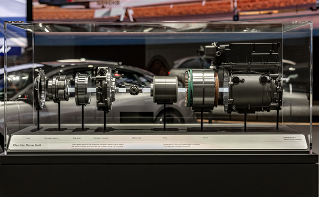 The Lucid Air's Electric Drive Unit (EDU) integrates the motor, transmission, and inverter into a compact, efficient system, delivering high power output while enhancing range and acceleration. Designed and manufactured in-house, the EDU ensures seamless integration with the vehicle's components. It also supports regenerative braking, converting kinetic energy into electric power to recharge the battery, further boosting efficiency and performance.