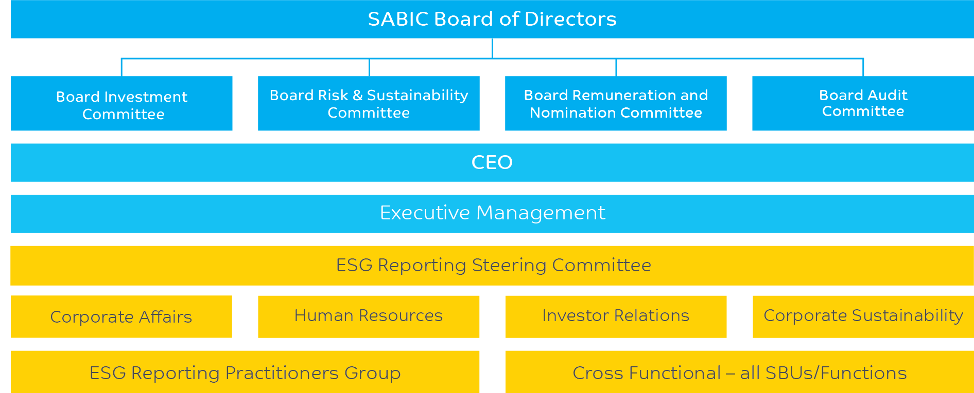 To this end, SABIC has established the ESG Reporting Steering Committee. The Committee’s primary task is to formulate and drive SABIC's ESG reporting strategy and roadmap and promote the integration of ESG factors into core business processes and decisions. Headed by our CFO, the Committee includes cross-functional representation from our Human Resources, Sustainability, Legal Affairs, Corporate Affairs, including Corporate Social Responsibility and Global Communications, and Investor Relations departments. The ESG Reporting Steering Committee is responsible for:
