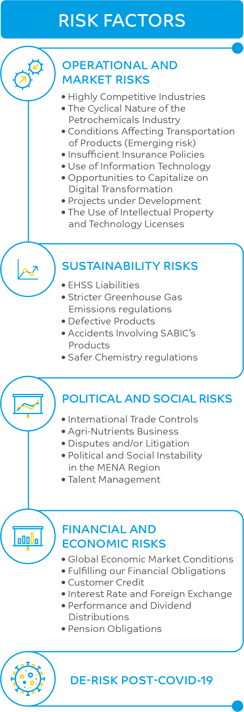 SABIC continues pursuing its strategic goals to maximize shareholder value through taking calculated risks that are predefined by the organization’s Risk Tolerance Framework. SABIC does not tolerate any scenarios or events leading to safety and security incidents that threaten the well-being of its employees, contractors, the public and/or impact the environment. SABIC does not tolerate any scenarios or events in relation to integrity, ethical/regulatory non– compliance and Intellectual Property breach and/or infringement.
