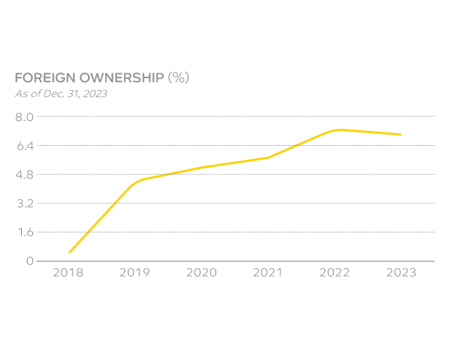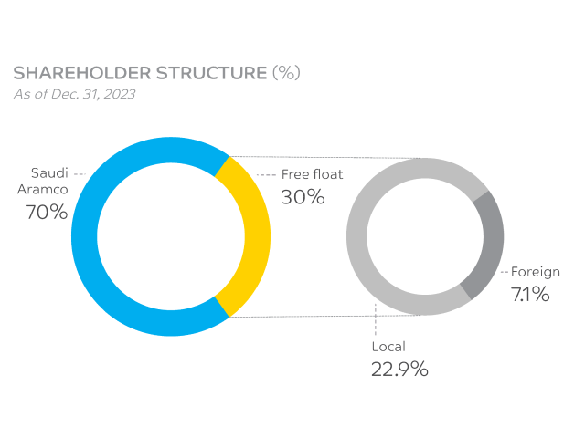 We went public in 1984 with a listing on the Saudi Stock Exchange, trading under company symbol 2010. At that time, the shareholder base was restricted to Saudi Arabia and other citizens in Gulf Cooperation Council (GCC) countries. In recent years, international investment into Saudi Arabia has risen significantly. In 2018, global financial market indices reclassified Saudi Arabia from a frontier market to an emerging market, marking a major turning point for the nation as it continued its advancement towards Saudi Vision 2030. This was accompanied by a wave of interest from the international investment community towards companies listed on the Saudi Stock Exchange, including SABIC: our foreign investor base has increased from under 1% in 2018 to 7.1% at the end of 2023.