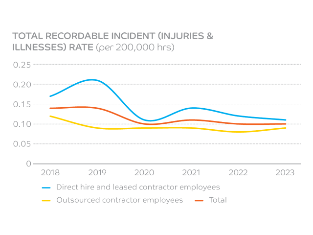 The total recordable incident rate remained stable from 2022, with the trend improving by 8% for direct hire and leased contractors and increasing by 13% for outsourced contractors.