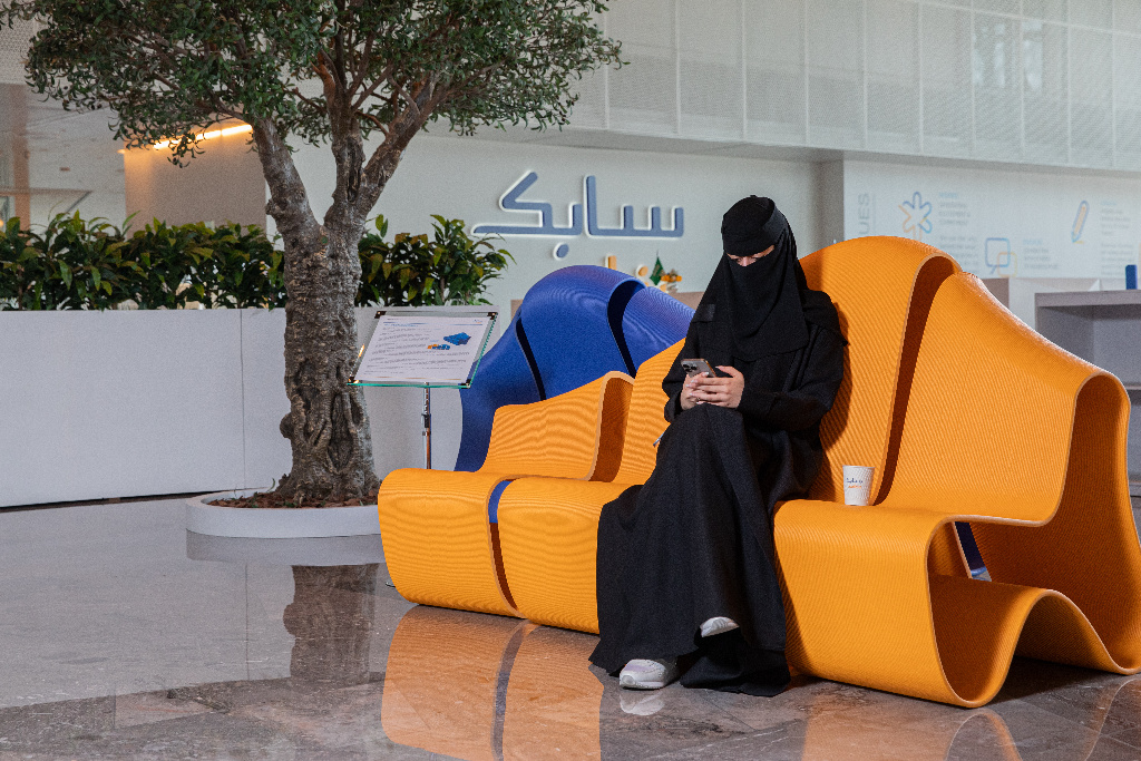Inside the lobby of SABIC's iconic building in Jubail, Saudi Arabia, stands a one-of-a-kind bench. At about ten feet in length, this sleek blue-orange seat is no mere piece of furniture. It also symbolizes a space for the future.