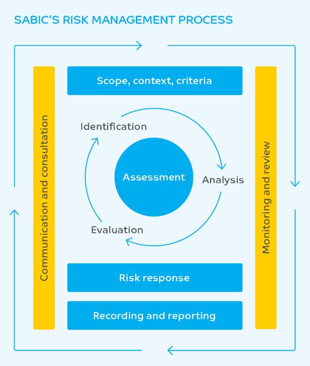 SABIC has a well-established risk management policy supported by an integrated governance system. Guided by international best practice standards, such as ISO and COSO, amongst others, SABIC's risk management process aims to effectively identify, understand, and manage threats to the company and its performance, while capitalizing on opportunities to advance strategic goals. This process also aids in establishing risk limits and controls and setting monitoring and reporting rhythms to enable business units and corporate functions to meet their objectives.
