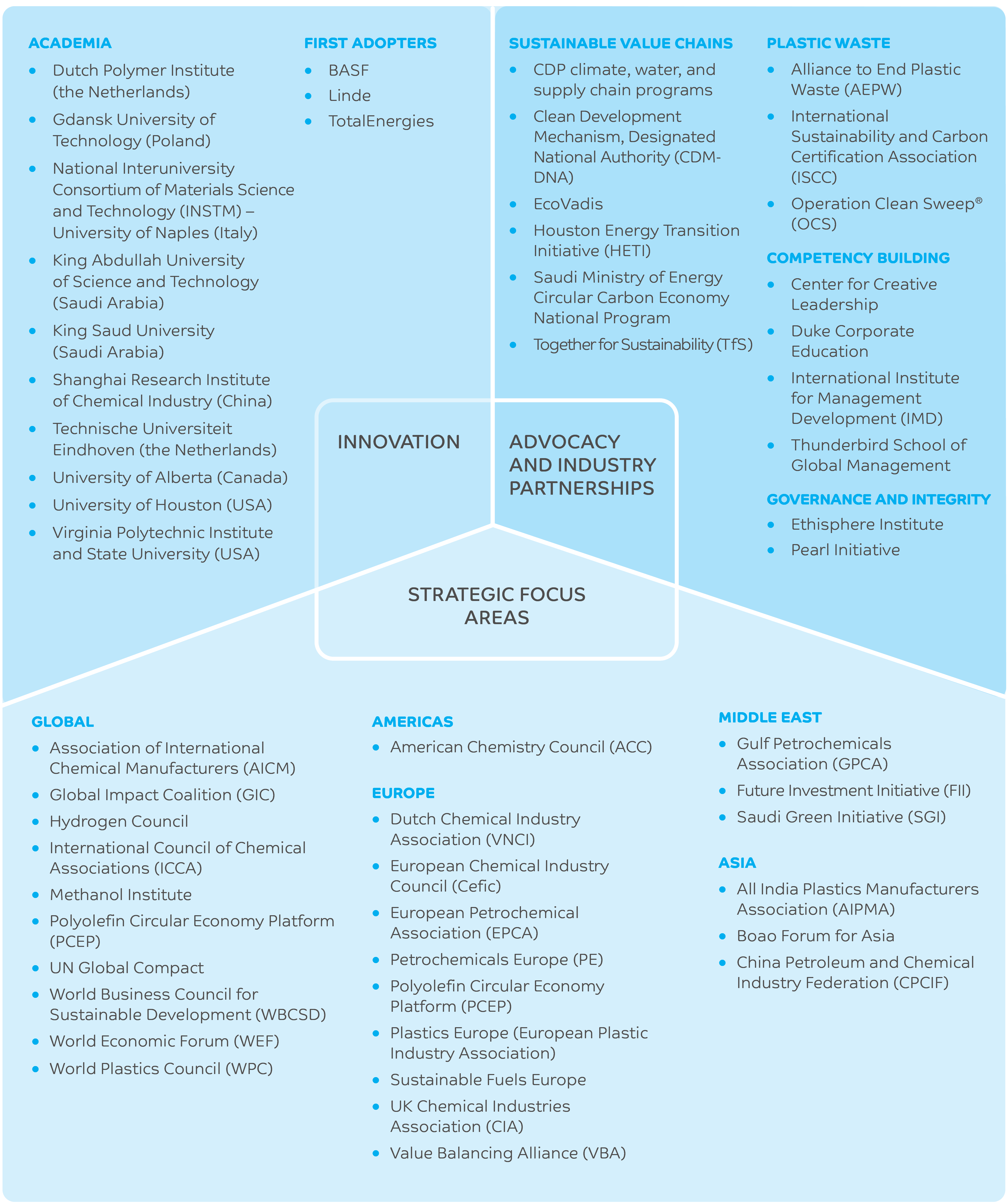 | External initiatives, collaborations, and trade associations | • Governance and integrity • Innovation and sustainability solutions • EHSS |