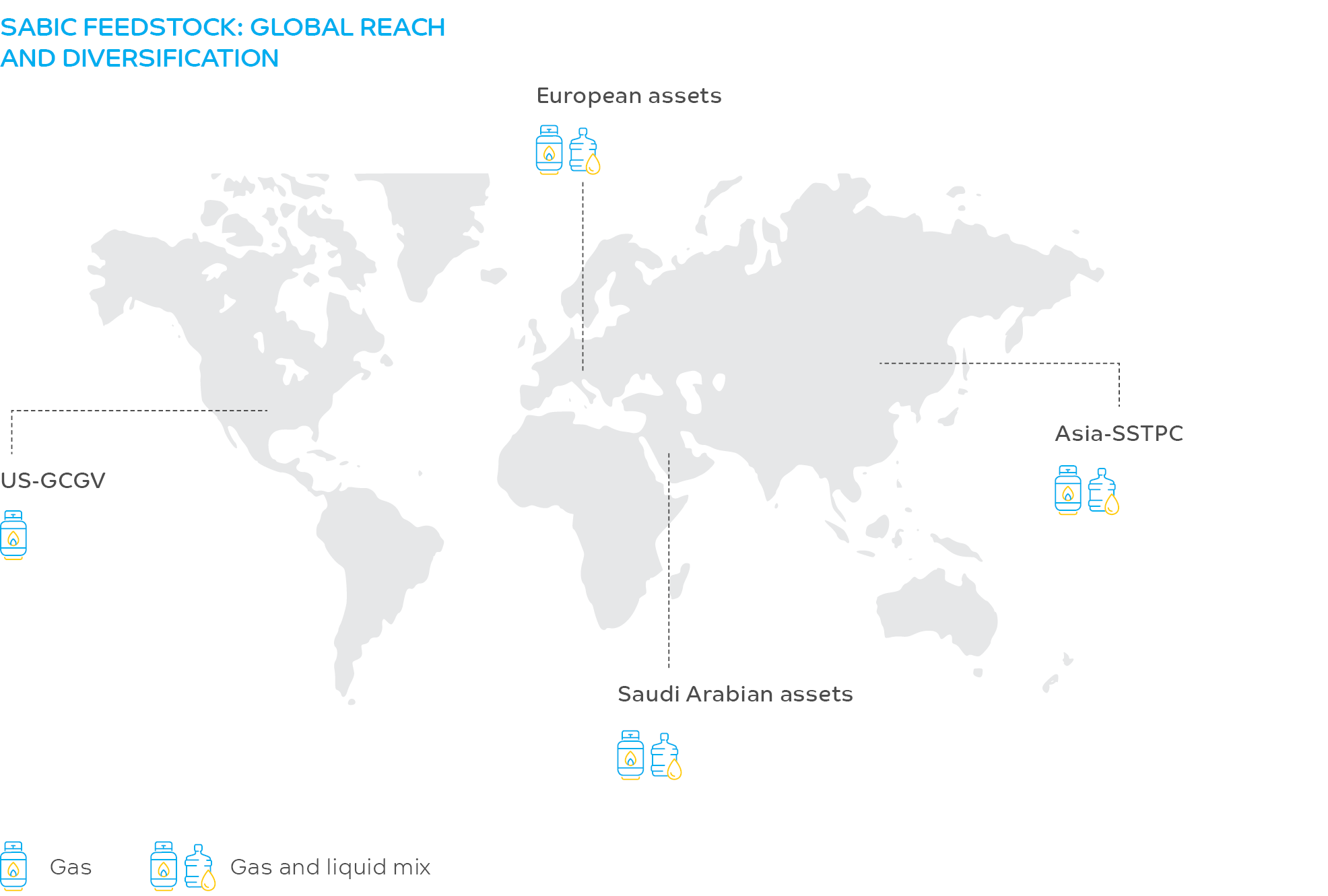 In Saudi Arabia, SABIC benefits from long-term feedstock agreements with Saudi Aramco. Efforts are underway to ensure optimal feedstock utilization and preserve value in the event of supply interruptions. Globally, SABIC is expanding its feedstock base to ensure supply stability. In 2024, the company announced the final investment decision (FID) for the SABIC Fujian Petrochemical Complex in China. This facility will feature a mixed-feed, LPG, and naphtha steam cracker and world-class downstream units, supporting SABIC's strategy to diversify feedstock sources. Meanwhile, our joint venture with SINOPEC in China uses a balanced mix of liquid and gas feedstocks.