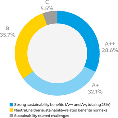 In 2020, we expanded our portfolio sustainability assessments to additional segments, and we have finished 56 product-application combinations, which covers about 84% of our entire polymers product portfolio, surpassing our set 80% target. Our analysis revealed that of these 56 applications, 16 have strong sustainability-related benefits, 18 have moderate benefits, 20 are neutral, and two have challenges.